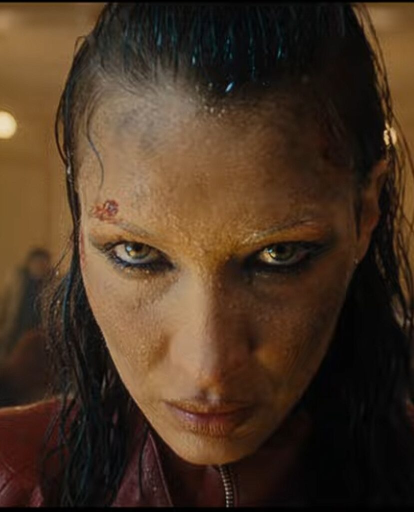 No trailer, vemos Bella Hadid caindo no meio de um restaurante, e não é porque trouxeram o pedido errado ou algo assim.