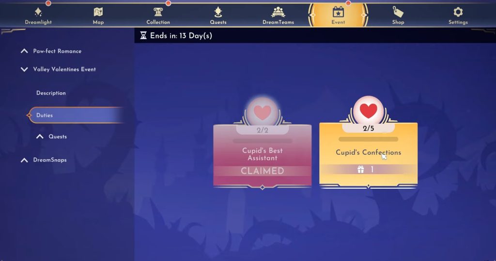Completar el deber del «Mejor asistente de Cupido» requerirá que Completa dos misiones diarias de Valley Valentines.. Todos los días, tendrás disponible una misión aleatoria de Valley Valentines para que la realices. Una vez que hayas completado dos misiones diarias, se completará el deber. Después de eso, puedes cobrar la recompensa haciendo clic en el deber en la pestaña del evento.